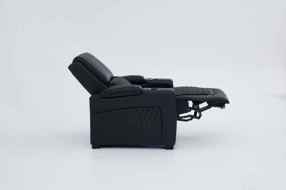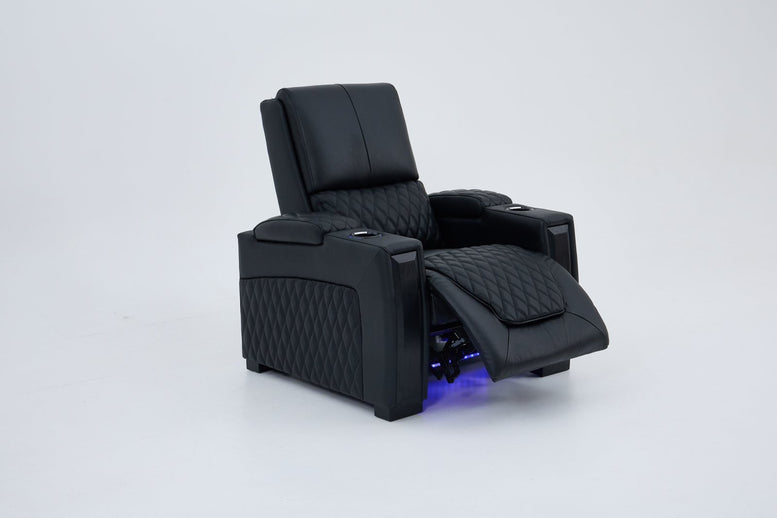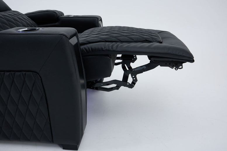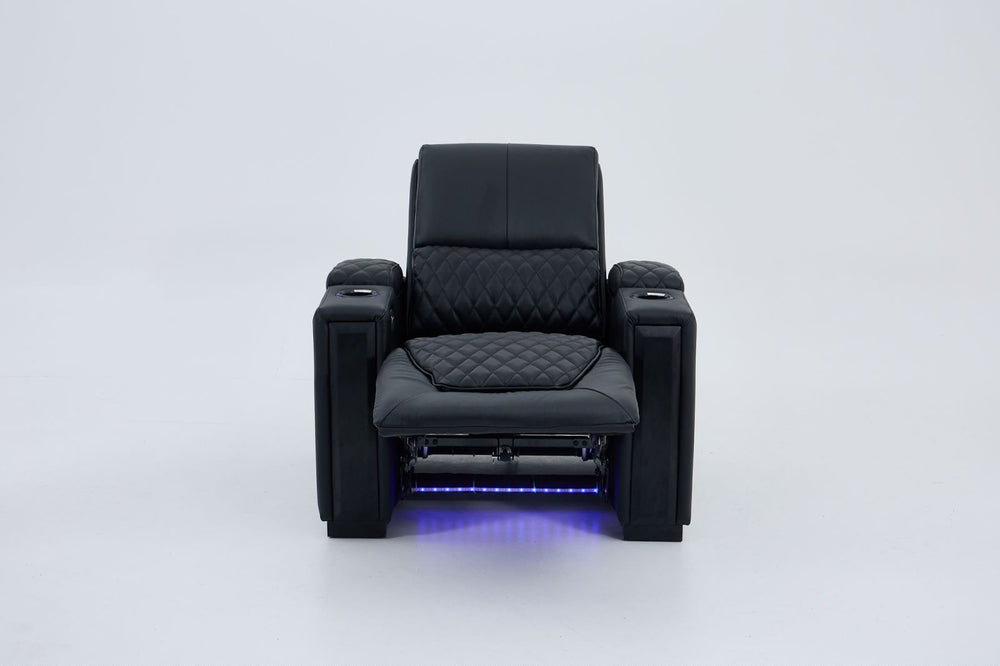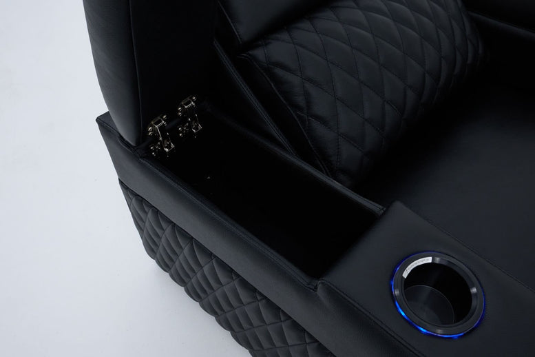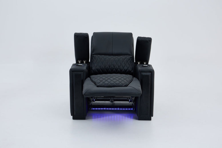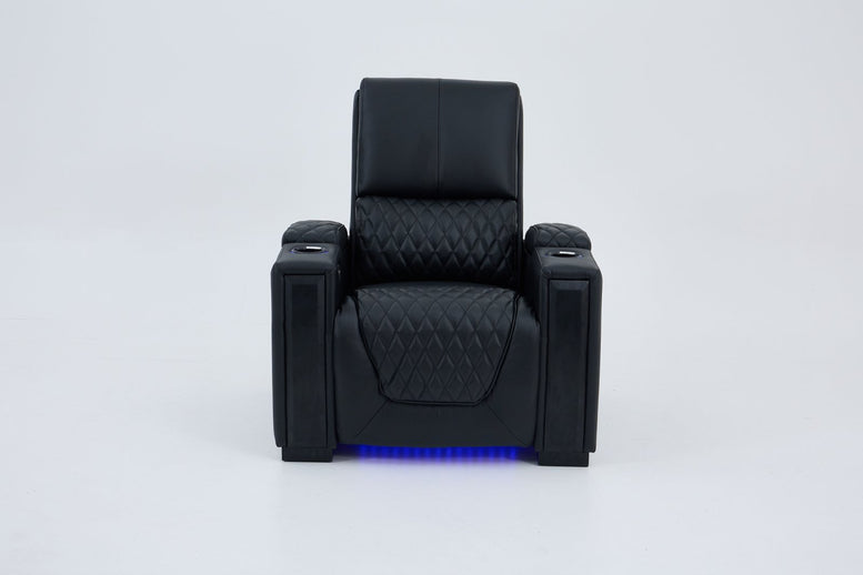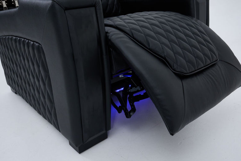 Transform your movie nights into a five-star cinematic experience with our top-grade genuine leather electronic home theater recliner. Expertly crafted for comfort, style, and convenience, each seat features plush diamond-stitched upholstery, power reclining mechanisms, and built-in cup holders for a true VIP feel. The sleek, modern design with ambient LED base lighting creates a dramatic and immersive atmosphere in any home theater setting.