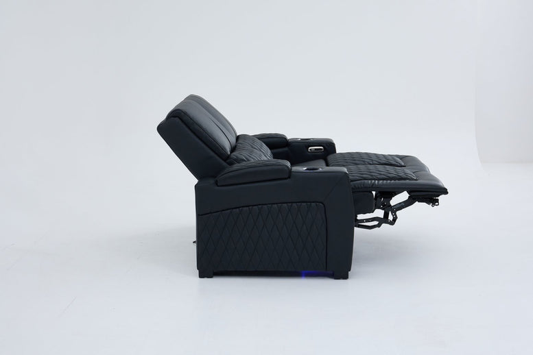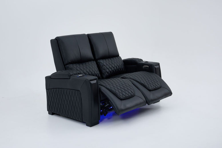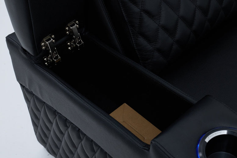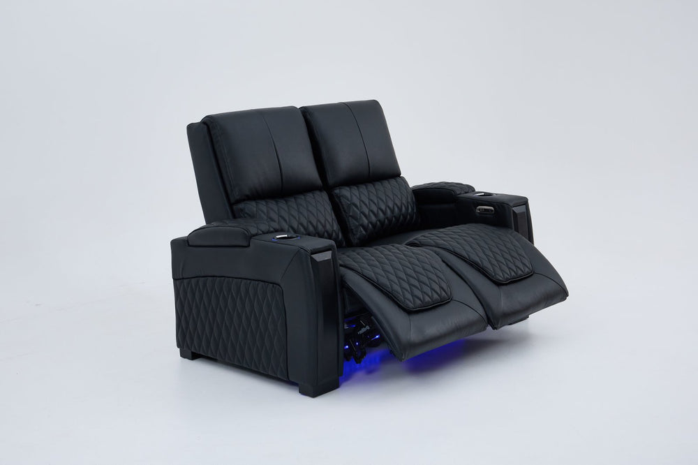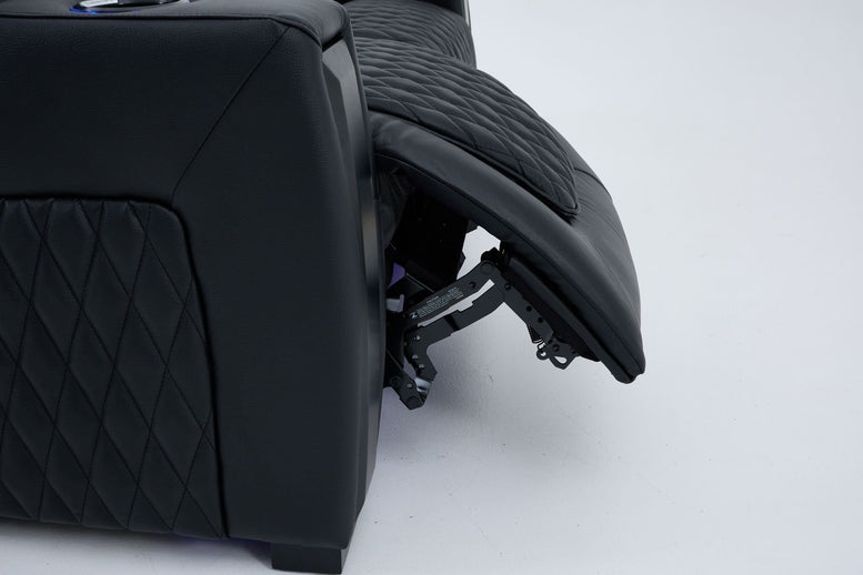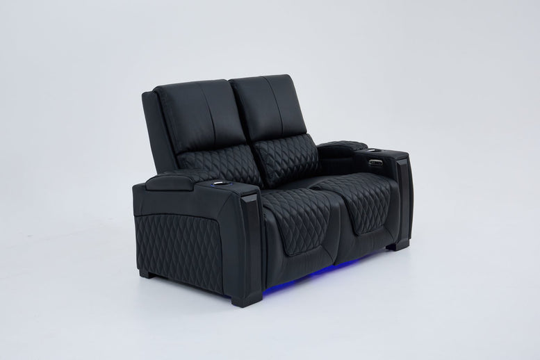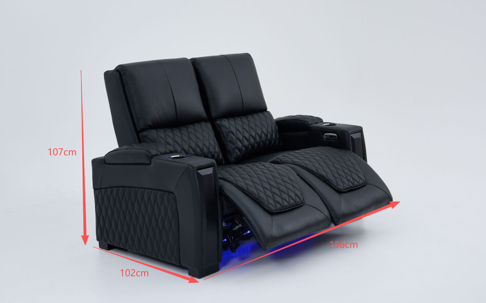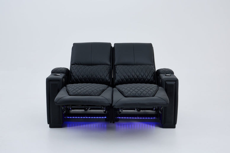 This special design is perfect for space efficiency and close relationship. Transform your movie nights into a five-star cinematic experience with our top-grade genuine leather electronic home theater recliner. Expertly crafted for comfort, style, and convenience, each seat features plush diamond-stitched upholstery, power reclining mechanisms, and built-in cup holders for a true VIP feel. The sleek, modern design with ambient LED base lighting creates a dramatic and immersive atmosphere in any home theater setting.