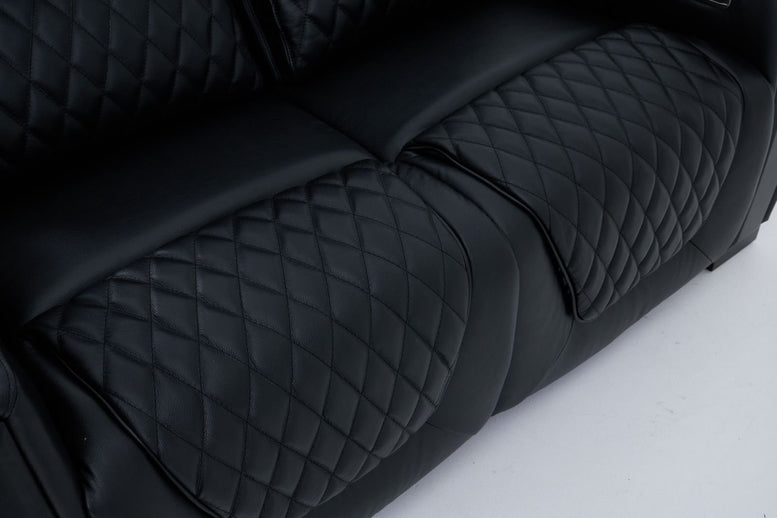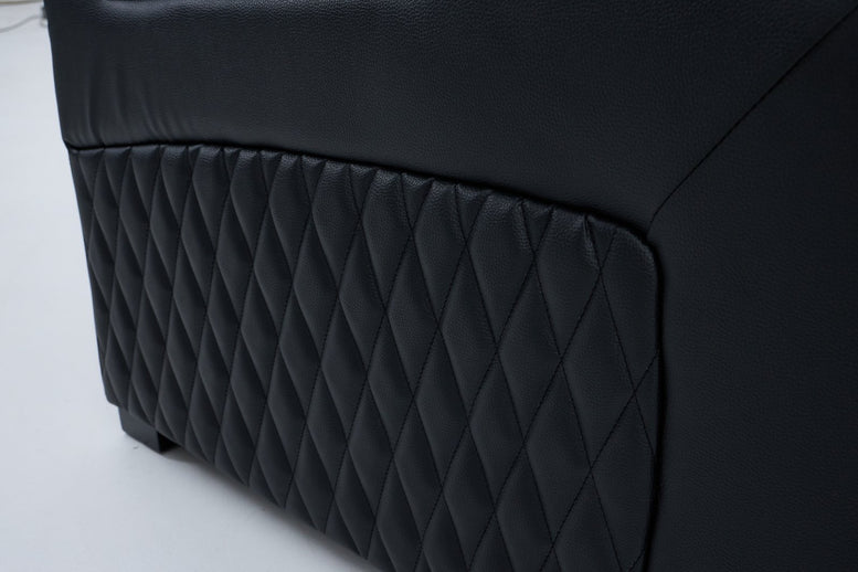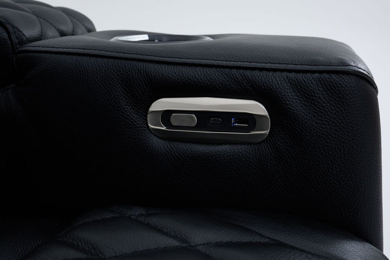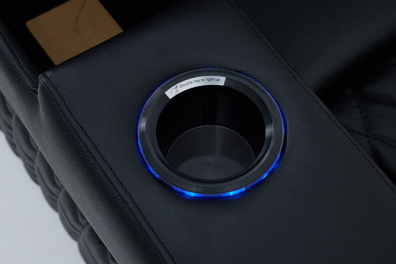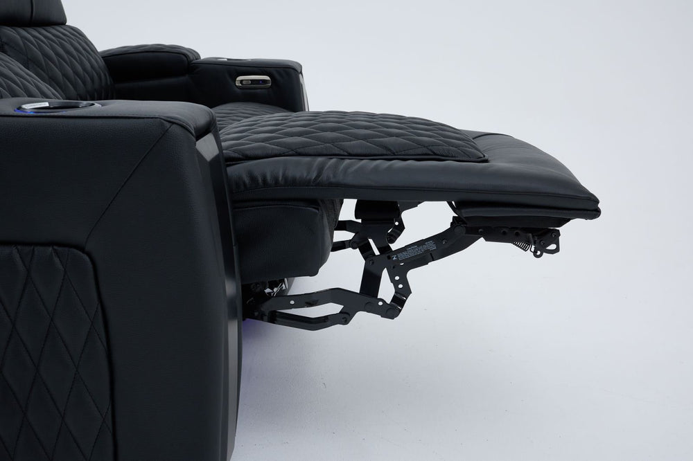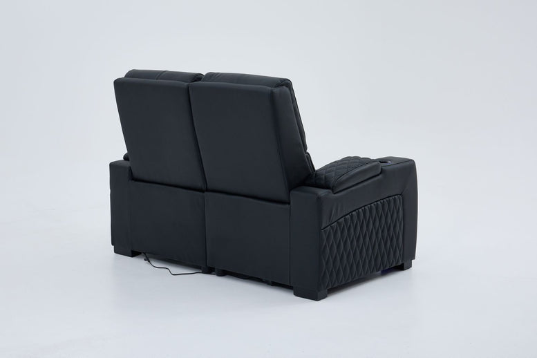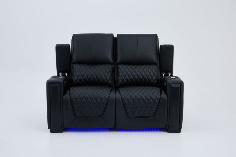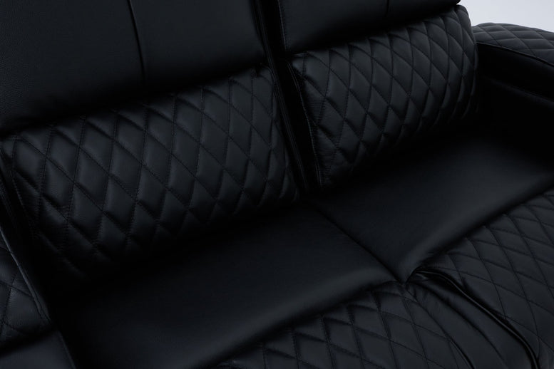 This special design is perfect for space efficiency and close relationship. Transform your movie nights into a five-star cinematic experience with our top-grade genuine leather electronic home theater recliner. Expertly crafted for comfort, style, and convenience, each seat features plush diamond-stitched upholstery, power reclining mechanisms, and built-in cup holders for a true VIP feel. The sleek, modern design with ambient LED base lighting creates a dramatic and immersive atmosphere in any home theater setting.