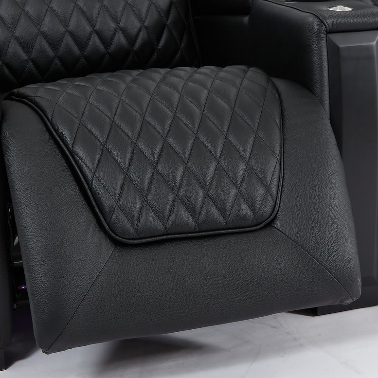 Transform your movie nights into a five-star cinematic experience with our top-grade genuine leather 3-seater electronic home theater recliner. Expertly crafted for comfort, style, and convenience, each seat features plush diamond-stitched upholstery, power reclining mechanisms, and built-in cup holders for a true VIP feel. The sleek, modern design with ambient LED base lighting creates a dramatic and immersive atmosphere in any home theater setting.