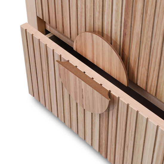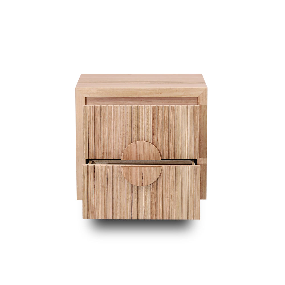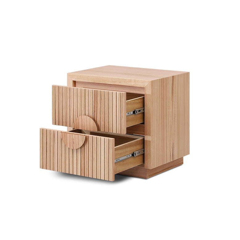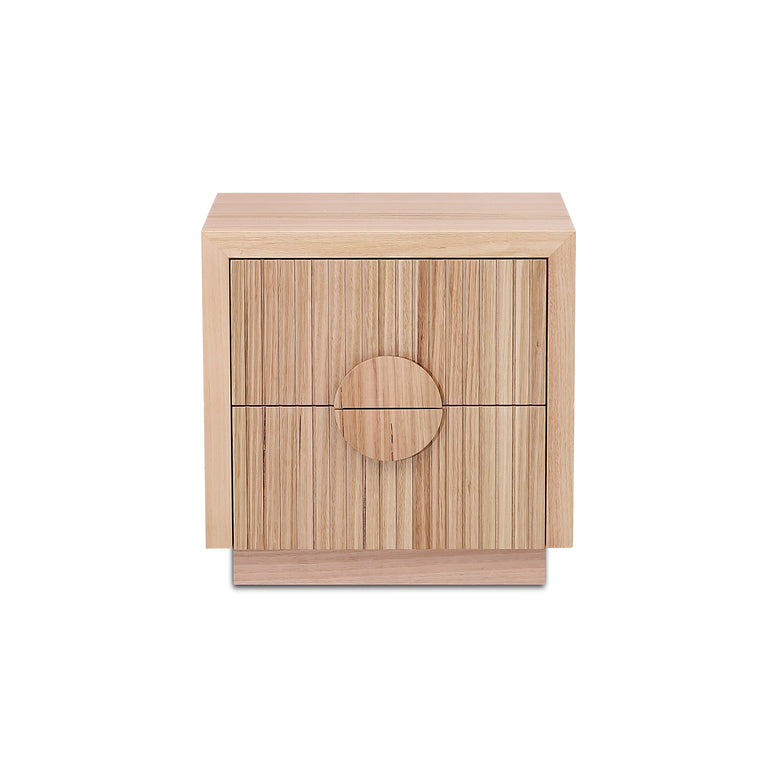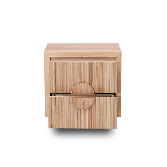 Monica bedside table features a clean, minimalist aesthetic with vertical slatted detailing and large circular handles, adding a touch of modern elegance to any bedroom.Perfect as a standalone piece or paired with matching bedroom furniture, the Ash Veneer bedside table will elevate the look of your space.
